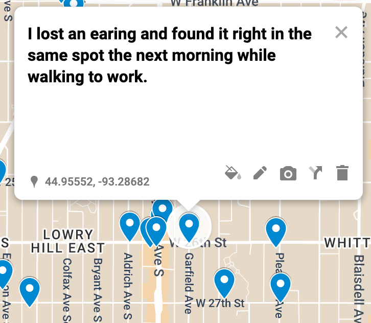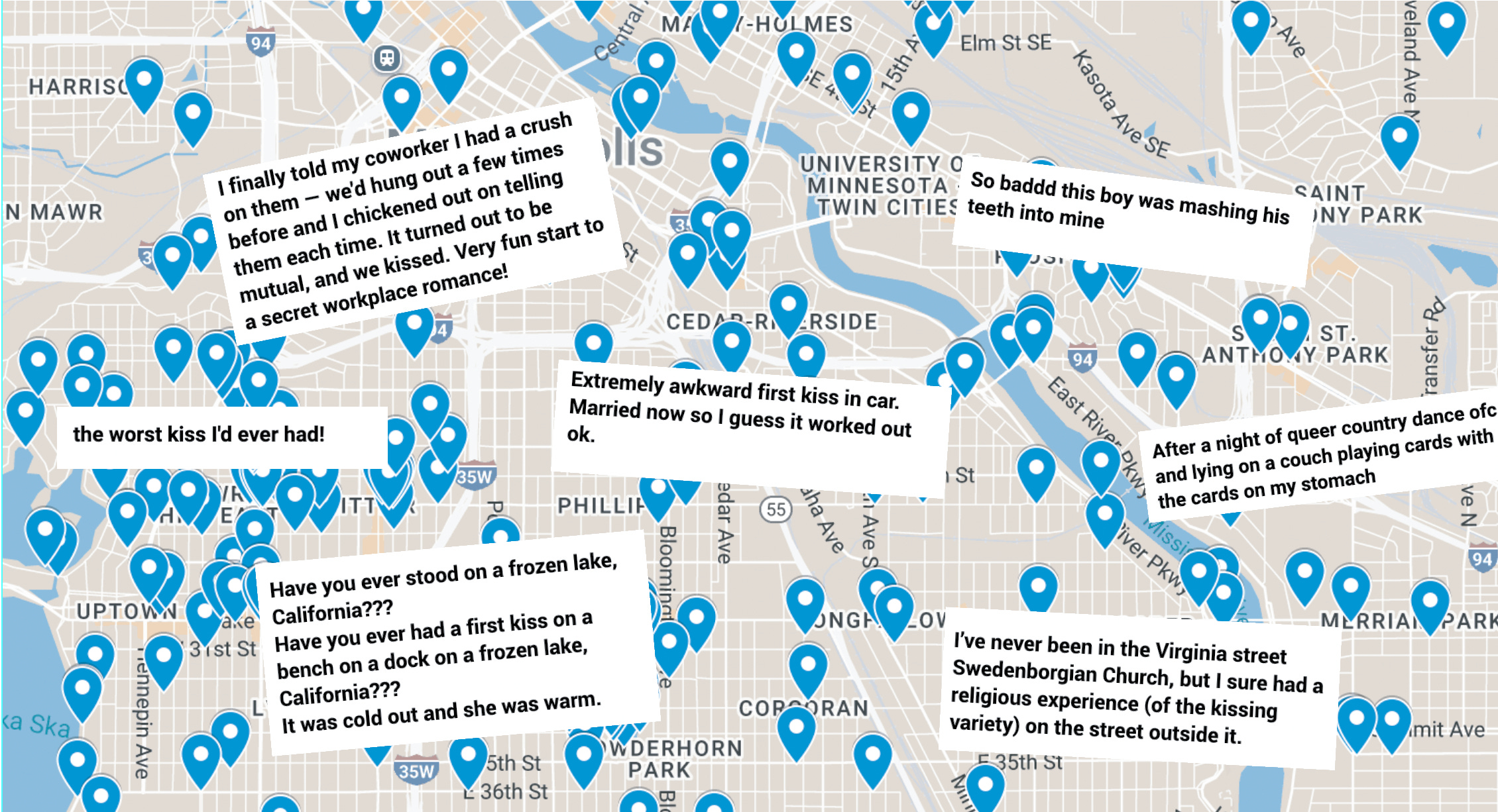 The long version is: for years I’ve been interested in the field of psychogeography, which is all about our personal relationships to physical (mostly urban) spaces. The route you took to school growing up, the streets that give us nostalgia, the spaces where the many past versions of us exist in the same geographies. In collecting stories and geographic data for this map, I am changing my relationship to the cities I live in through the stories of others. Now when I cross 26th and Lyndale, I think of the all the kisses between strangers that happened there (more than most intersections according to my data so far!) and wonder what this earring looked like.